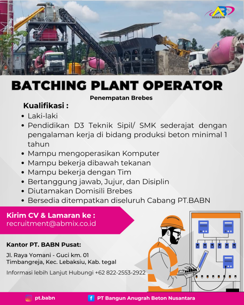 BATCHING PLANT OPERATORVICKY SHABRINA EL HADI11/03/2026 Kategori Pekerjaan: Produksi Waktu Pekerjaan: Full-time Lokasi Pekerjaan: AB Limbangan Kersana Brebes Apply for this position Full Name *Email *Phone *Cover Letter *Upload CV/Resume *Allowed Type(s): .pdfSaya menyatakan bahwa seluruh data yang saya berikan adalah benar dan dapat dipertanggungjawabkan. *